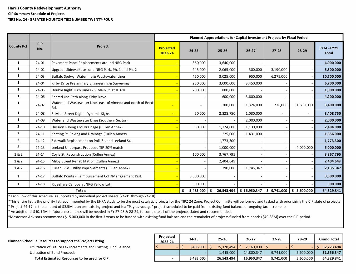 The following 2024-2029 capital improvement project (CIP) list, located in TIRZ 24, has been approved by both boards for initiation according to the schedule in the CIP. Additional project information will be available as each project is approved for construction.
